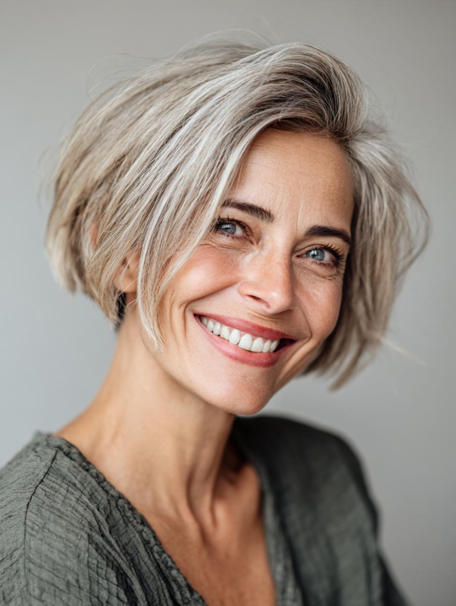This stunning silvery-blonde bob with subtle darker roots proves that going gray can be the most rebellious beauty move of all. Styled with tousled, lived-in texture and a modern asymmetrical cut that hits just below the jawline, this look radiates confidence and contemporary edge. Paired with a relaxed olive-green textured top, the overall vibe is sophisticated yet playful—perfect for women who want to embrace their natural color evolution while maintaining an undeniably youthful spirit.