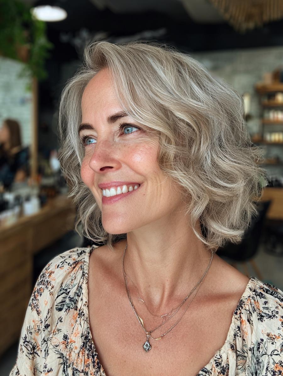 This stunning ash-blonde bob proves that embracing your natural silver tones can be the ultimate power move, with perfectly tousled layers that create movement and dimension. Paired with a charcoal knit sweater and a delicate silver pendant necklace, the look strikes the perfect balance between polished and relaxed. The side-swept styling adds softness while maintaining that coveted “I woke up like this” effortlessness that transcends any age category.