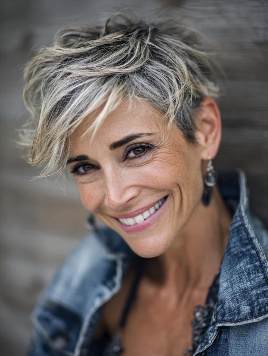 This stunning woman rocks a beautifully textured short pixie cut that showcases gorgeous silver-blonde highlights interwoven with darker roots, creating natural dimension and movement. Paired with a classic denim jacket in a soft blue wash, the look epitomizes casual sophistication with an edge. The tousled, piece-y styling adds youthful energy while the metallic drop earrings provide just the right amount of polish to elevate this effortlessly cool ensemble.