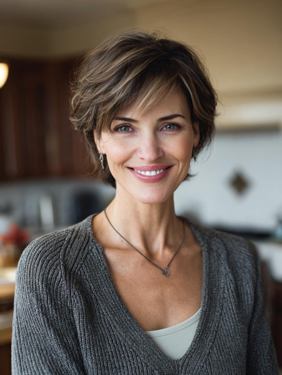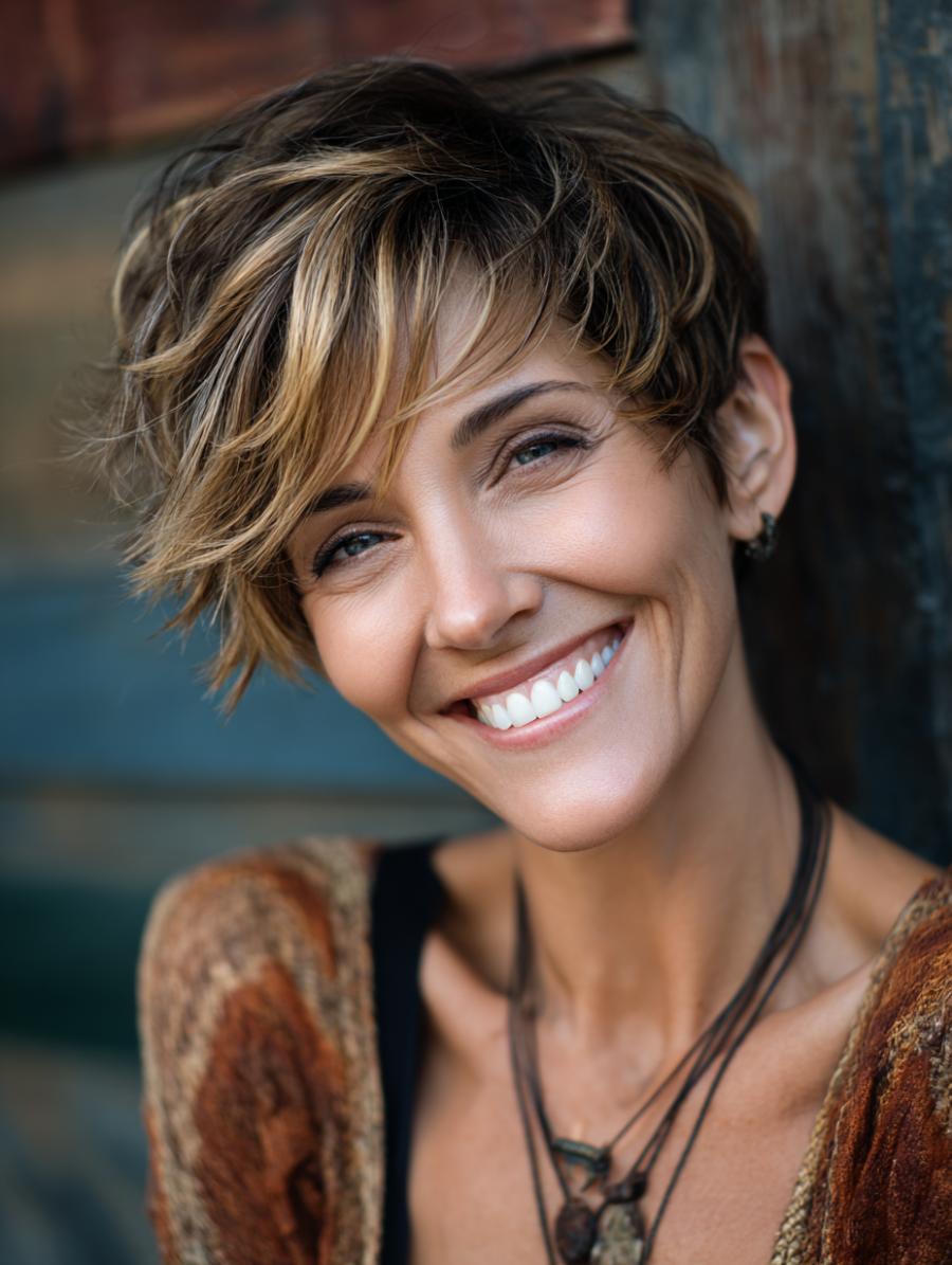This gorgeously layered pixie cut features dimensional blonde highlights dancing through rich brunette base tones, creating movement and depth that catches the light beautifully. She’s styled it with an effortlessly tousled finish and swept side-swept bangs that frame her face perfectly. The look is completed with layered leather cord necklaces and what appears to be a cozy rust-colored knit sweater, embodying that perfect balance of edgy sophistication and approachable warmth.