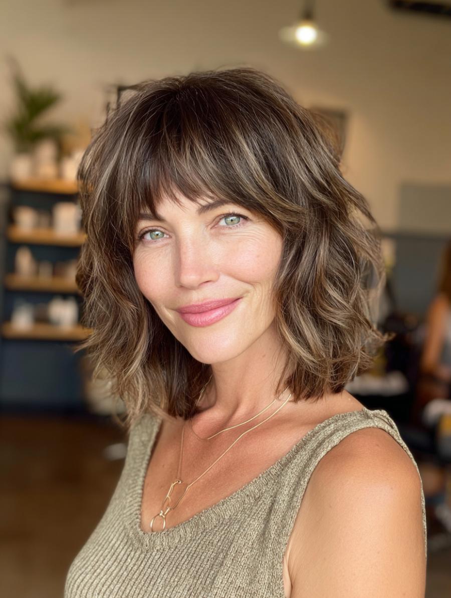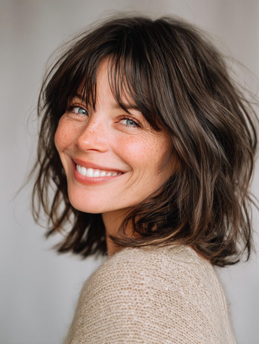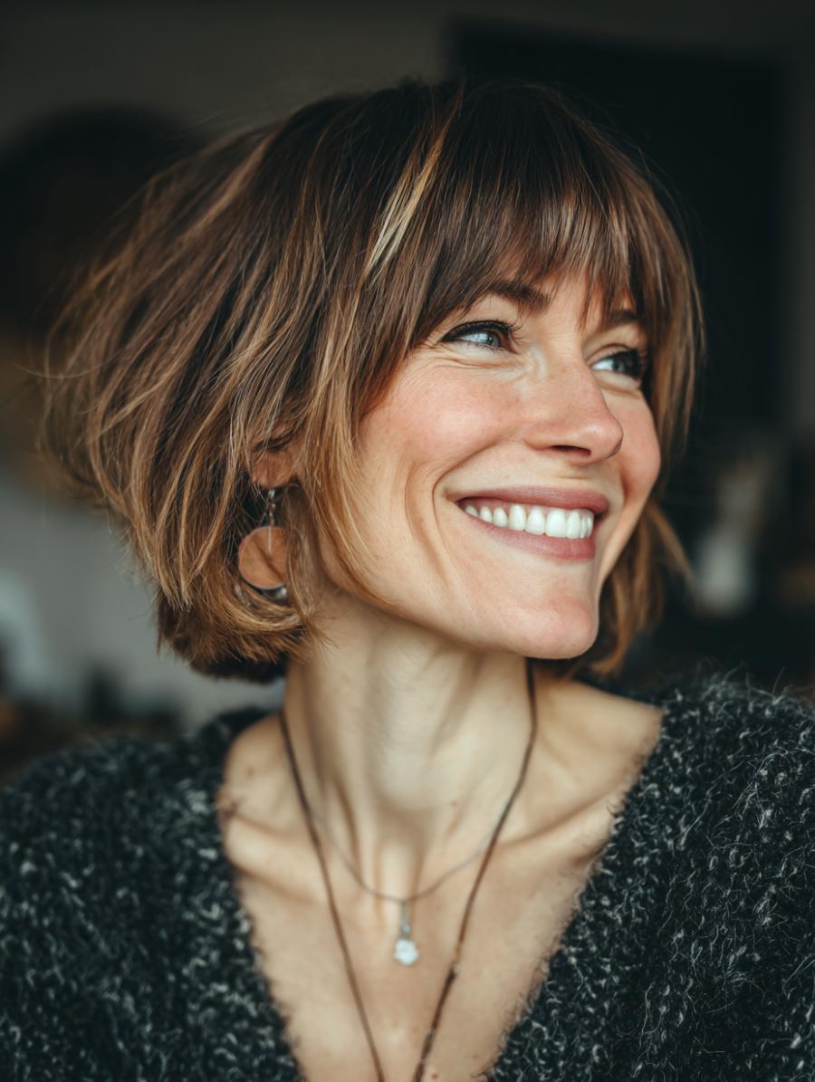 This gorgeous brunette bob showcases perfectly tousled waves with subtle caramel highlights that catch the light beautifully, paired with wispy, face-framing bangs that add instant youthful energy. She’s styled it with a cozy cream cable-knit sweater that exudes casual sophistication, proving that the best hairstyles are the ones that look like you just rolled out of bed looking absolutely radiant. The overall vibe is effortlessly polished with a hint of that coveted “undone” texture that makes this cut feel fresh and modern.