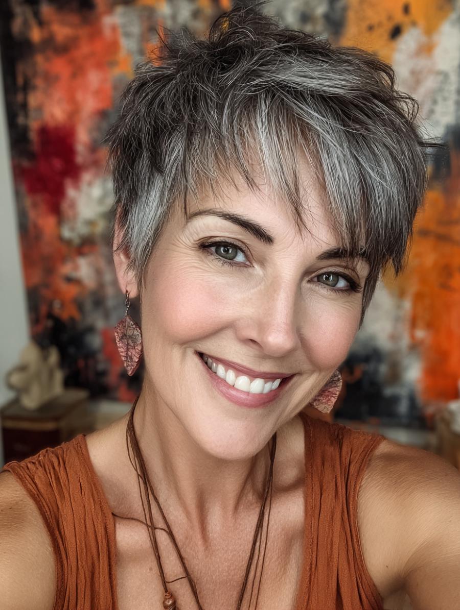 This effortlessly chic look showcases how a tousled silver pixie cut can be the ultimate statement piece, paired with warm terracotta drop earrings that complement her rust-colored sleeveless top. The textured, piece-y layers create movement and volume while the silver tones catch the light beautifully, proving that embracing natural color changes can be incredibly sophisticated. The overall vibe is confidently casual yet polished—perfect for someone who knows that great style transcends any arbitrary age rules.