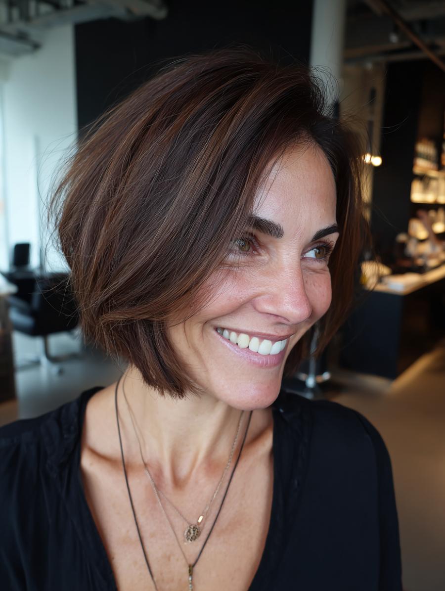 This gorgeously textured chocolate brown bob features perfectly imperfect waves that look like you just rolled out of bed looking amazing – but in the best possible way. The piecey, side-swept bangs and choppy layers create movement and dimension that’s both playful and sophisticated, proving that “age-appropriate” is just another phrase for boring. Paired with a crisp white strappy top, this carefree style embodies that coveted “I woke up like this” energy that transcends any arbitrary style rulebook.