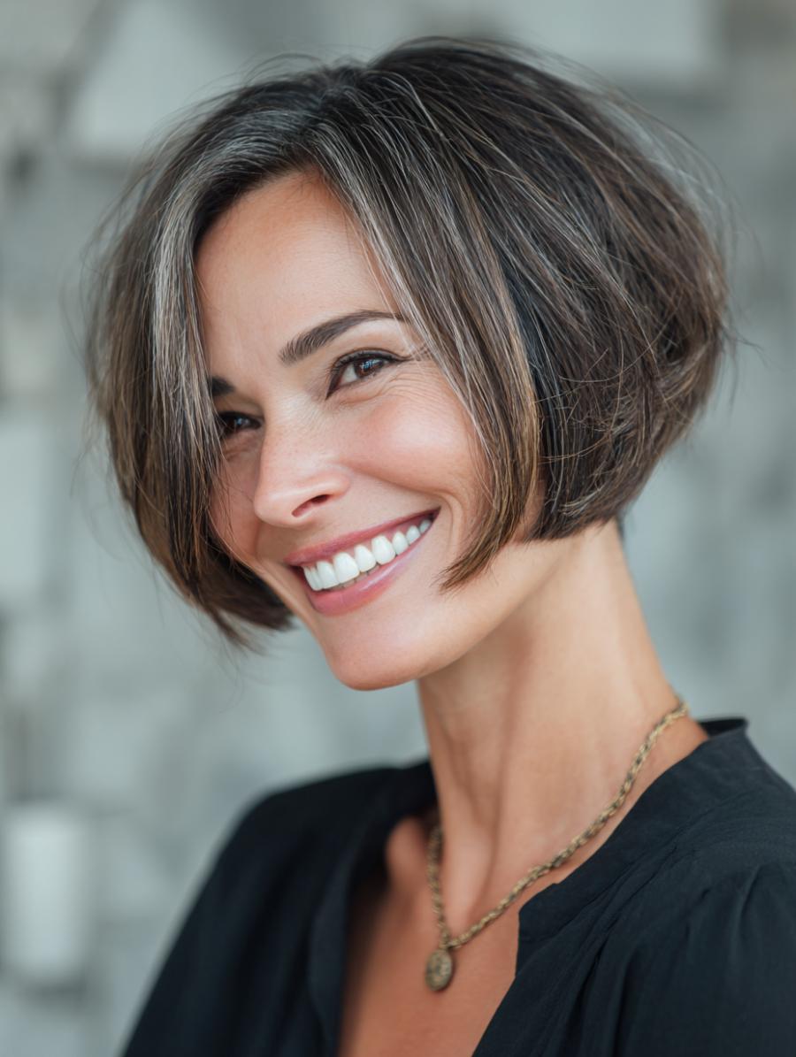 This stunning graduated bob showcases natural gray and silver strands woven beautifully through brunette layers, creating a sophisticated salt-and-pepper effect that catches the light. The sleek, chin-length cut is perfectly styled with subtle volume and movement, while the wearer’s radiant smile and simple black top with delicate gold chain necklace complete this effortlessly chic look. It’s proof that embracing your natural color transition can be the most youthful choice of all.