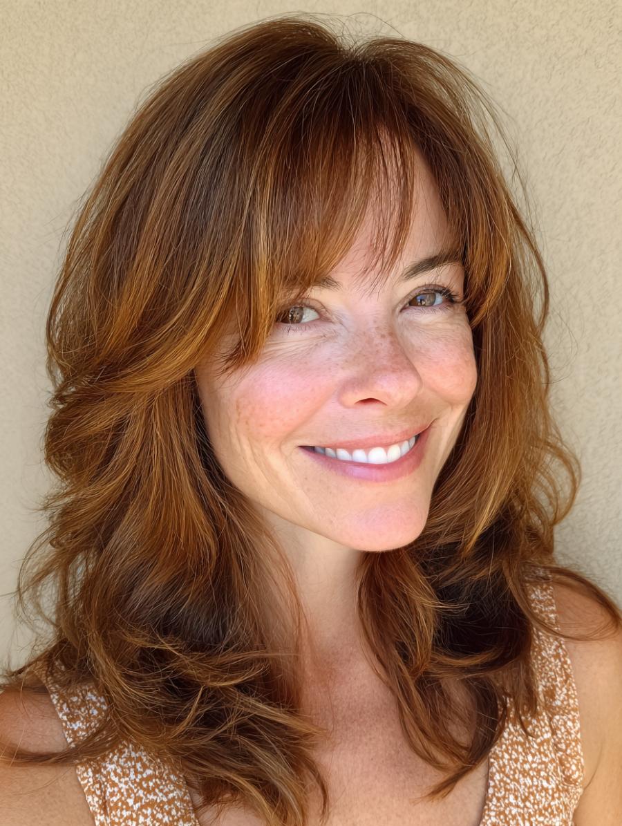 This gorgeous auburn-to-honey balayage proves that rich, dimensional color knows no age limit, with face-framing bangs and tousled waves that exude effortless sophistication. Paired with what appears to be a delicate cream or champagne-toned top with subtle texture, the overall look strikes the perfect balance between polished and playfully undone. The warm golden highlights catch the light beautifully, creating movement and vitality that’s anything but “age-appropriate” – and that’s exactly the point.
