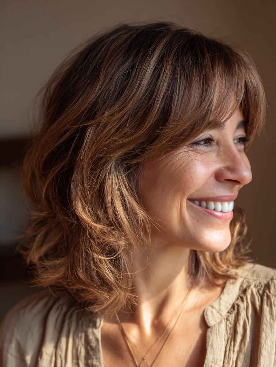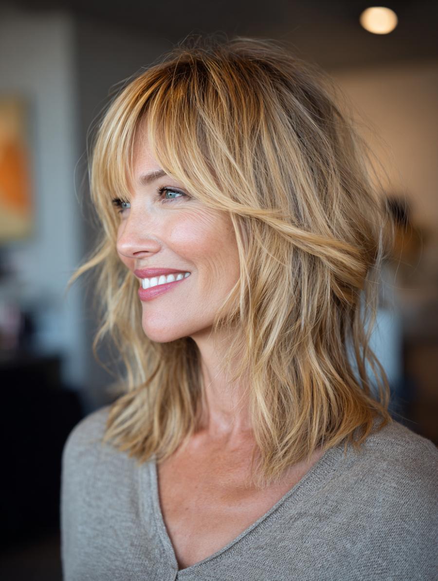 This gorgeous layered shag showcases honey-blonde highlights with darker roots, creating natural dimension and movement that flatters any age. The soft, tousled waves and wispy side-swept bangs frame the face beautifully, while the shoulder-length cut feels fresh and modern. Paired with a relaxed gray knit top, this hairstyle embodies that coveted “I woke up like this” vibe that’s both sophisticated and youthfully carefree.