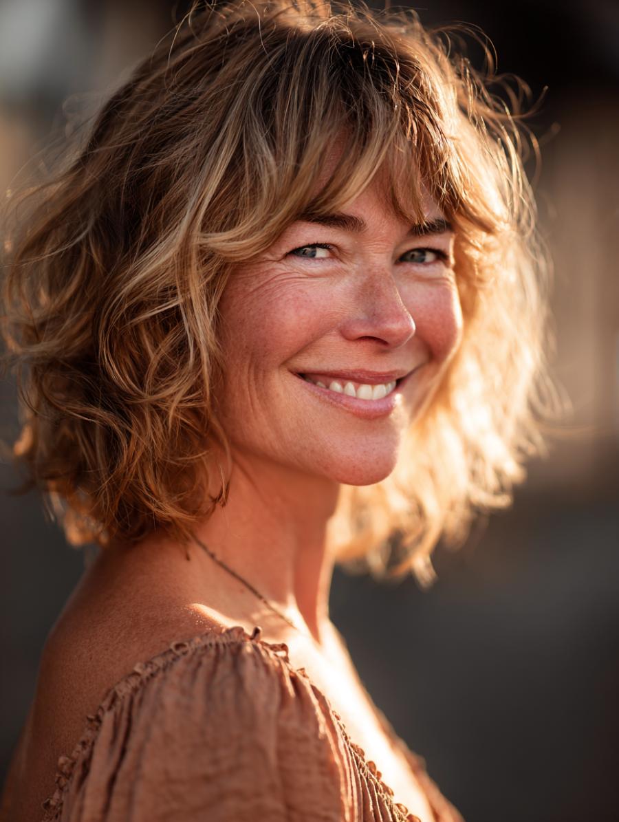 This gorgeous honey-blonde bob with tousled, beachy waves perfectly embodies that coveted “undone” texture that looks effortless but is anything but accidental. Paired with an off-shoulder terracotta peasant top featuring delicate eyelet detailing along the neckline, the look channels bohemian goddess vibes with a modern twist. The warm golden lighting catches every dimension of her layered cut, proving that this shag-inspired style is the perfect rebellion against any outdated notion of “mature” hair.
