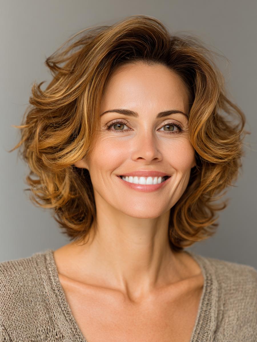 This gorgeous honey-blonde bob showcases perfectly tousled waves that create natural movement and body, proving that textured styles can be both sophisticated and playful. The warm golden highlights catch the light beautifully while the chin-length cut frames the face with an effortless, lived-in elegance. Paired with a soft taupe knit sweater, this look embodies the kind of polished-yet-relaxed aesthetic that transcends any arbitrary age rules.