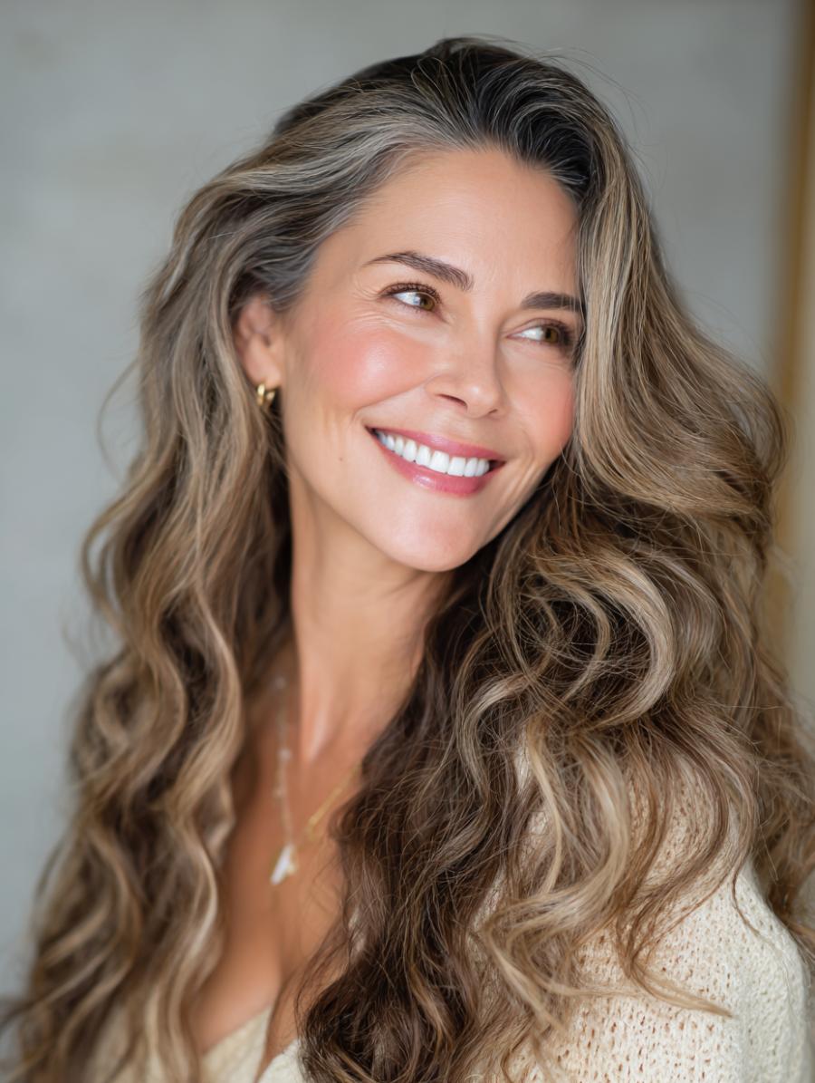 This gorgeous cascade of honey-blonde highlights and rich brunette lowlights creates dimensional waves that flow past the shoulders with enviable movement and shine. Paired with a cream cable-knit sweater that adds cozy sophistication, the look strikes the perfect balance between polished and lived-in. The side-swept styling and natural texture prove that embracing your hair’s body and length creates an ageless elegance that defies any arbitrary style “rules.”