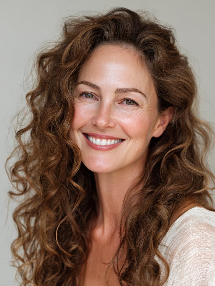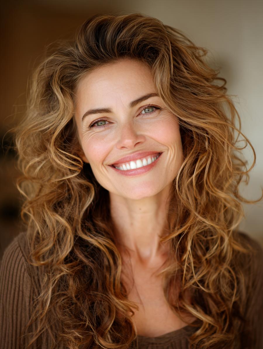 This gorgeous example showcases voluminous, honey-highlighted curls that cascade past the shoulders with natural movement and bounce. Paired with a soft, cream-colored textured top that adds subtle sophistication, the look epitomizes that coveted “undone” elegance. The warm, multi-tonal brown hair with golden highlights creates depth and dimension that flatters at any age while maintaining a fresh, youthful energy.