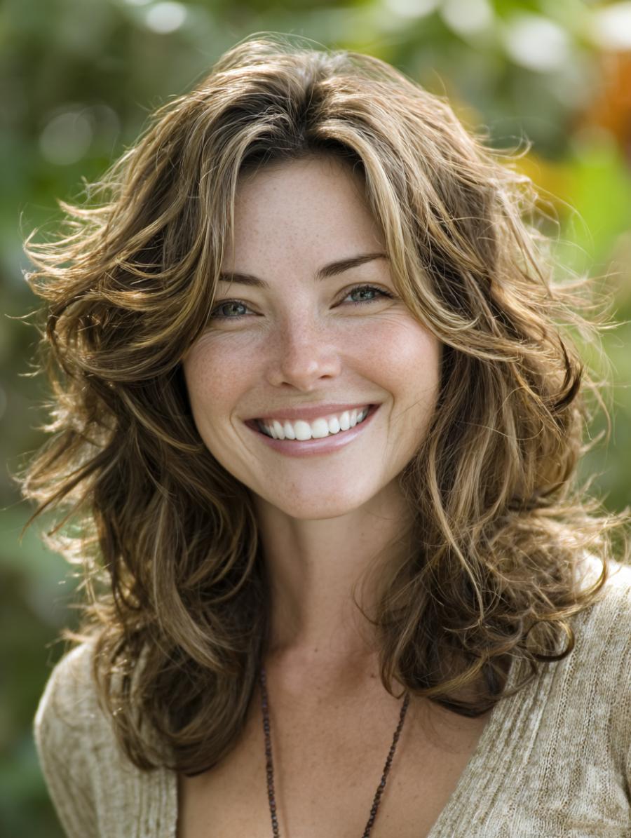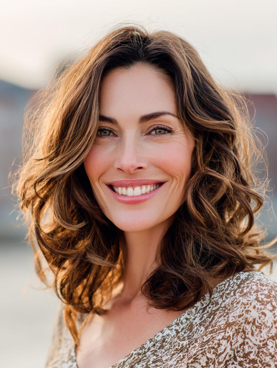 This stunning brunette showcases perfectly tousled, shoulder-length waves with gorgeous natural highlights that catch the warm sunlight like liquid gold. Her hair moves freely with an organic, lived-in texture that embodies the kind of effortless beauty that transcends any arbitrary age guidelines. Paired with what appears to be a delicate lace-trimmed top in warm earth tones, this look radiates confidence and natural glamour that proves great hair has no expiration date.