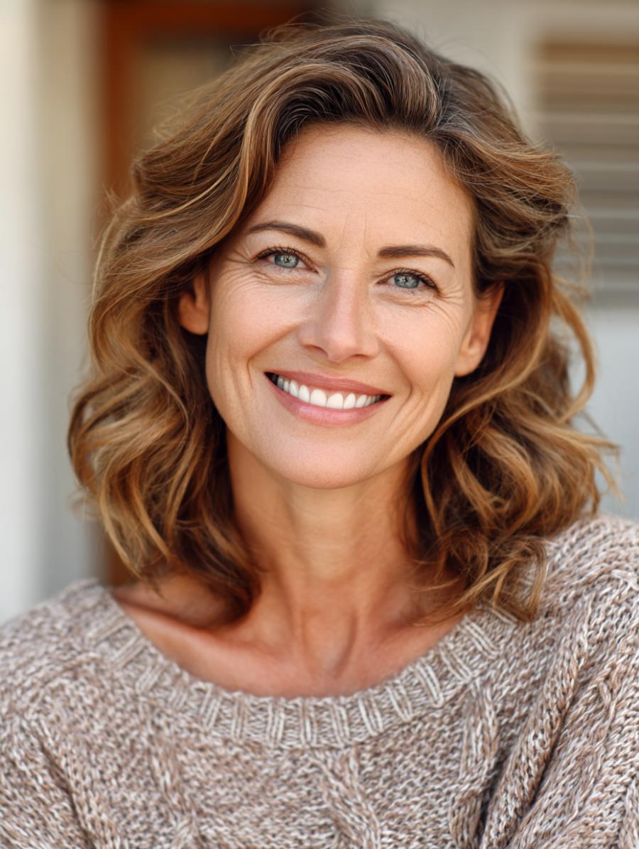 This stunning look pairs gorgeously tousled honey-blonde waves with a luxuriously soft cable-knit sweater in creamy oatmeal tones. The chunky knit texture and relaxed boat neckline create an effortlessly elegant vibe that’s both comfortable and sophisticated. Her hair showcases beautiful dimension with golden highlights that catch the light, proving that textured, shoulder-length waves are the ultimate “I woke up like this” hairstyle that works at any age.
